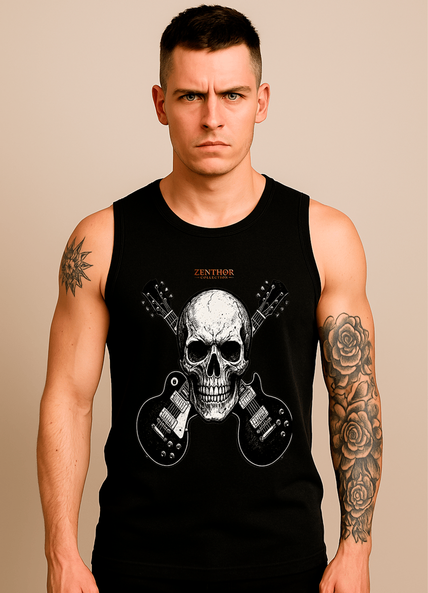 Essa arte é o brasão oficial da irmandade do riff sujo, da distorção latejante e da vida sem solo limpo. Caveira na linha de frente, guitarras cruzadas como espadas, isso aqui não é camiseta. É declaração de guerra!