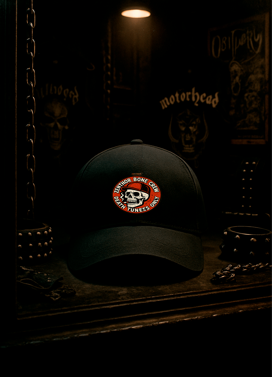 O patch traz um crânio estilizado com fone e boné, e a frase direta e sem rodeios: Zenthor bone crew – death tunes only.