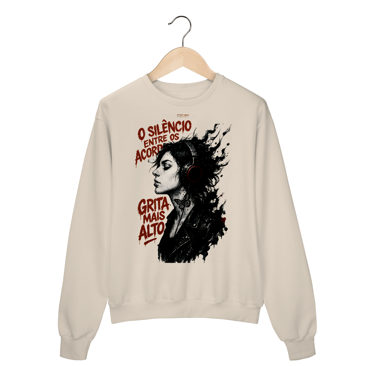 O moletom traz a ilustração intensa de uma mulher com fones de ouvido, totalmente imersa no som e no vazio entre as notas. Uma homenagem à pausa que antecede a explosão do próximo riff.